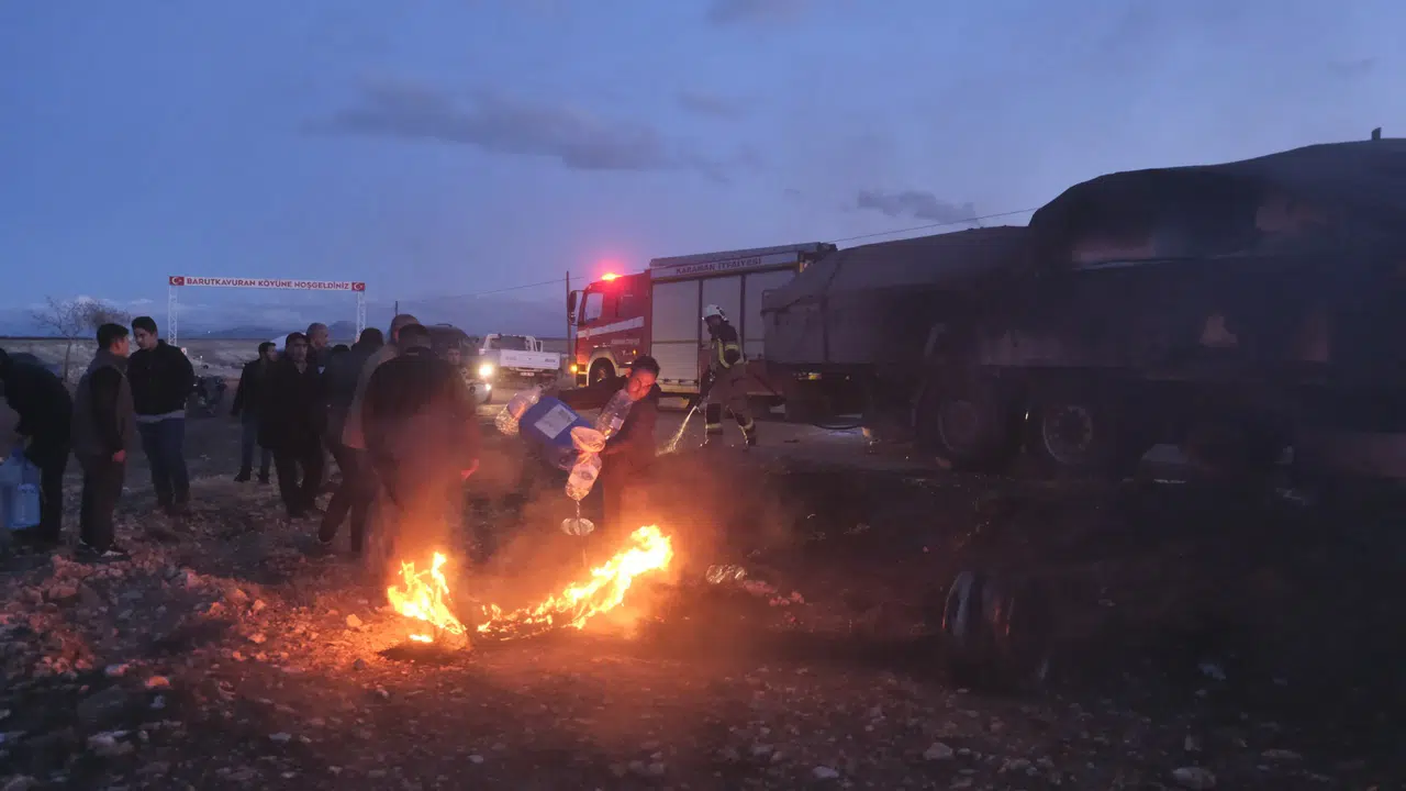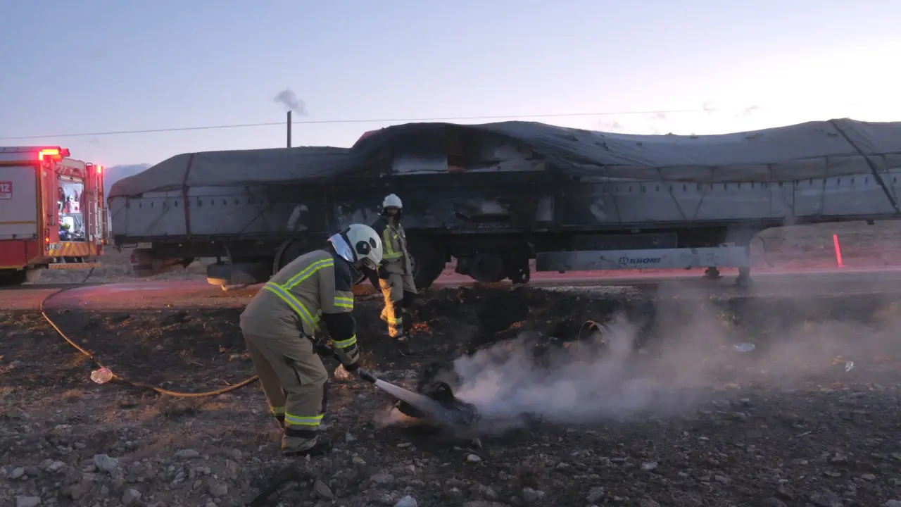 Karaman’da seyir halindeki mermer yüklü tırın dorsesinde çıkan yangın, köylülerin su bidonları ve yangın tüpleriyle yaptığı müdahale sayesinde büyümeden söndürüldü.