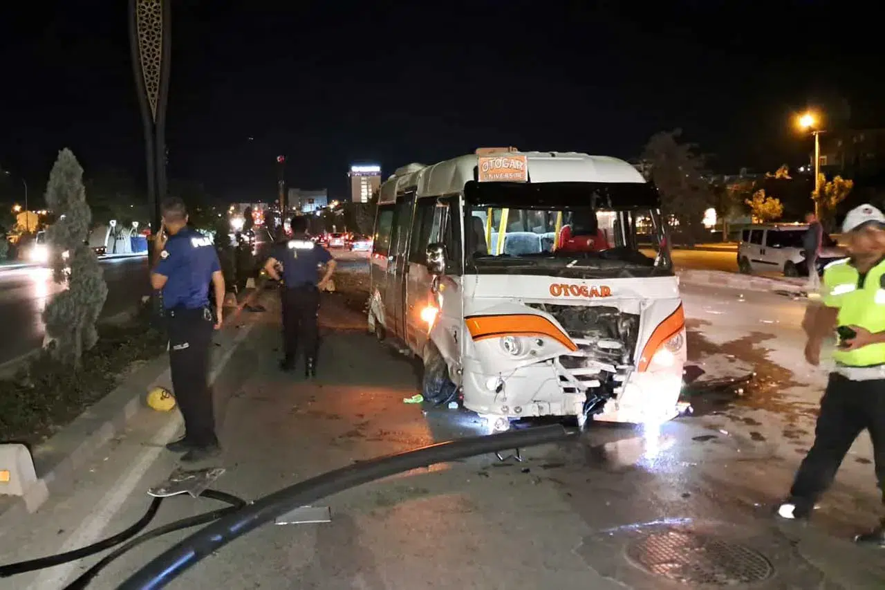 Karaman’da kontrolden çıkan yolcu minibüsü, orta refüjü aşarak karşı şeride geçti. Kaza sonrası sürücü olay yerinden ayrılırken, minibüsün çarptığı çam ağaçları köklerinden kırılırken, aydınlatma direği de devrildi.