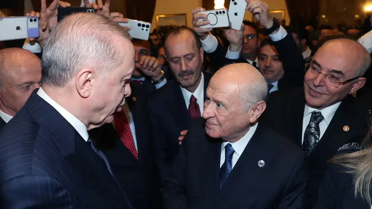 Resepsiyon kapsamında Erdoğan, Devlet Bahçeli ile ayaküstü sohbet ederken, DEM Parti Eş Genel Başkanı Tuncer Bakırhan ve TBMM Başkanvekili Pervin Buldan ile de görüştü.