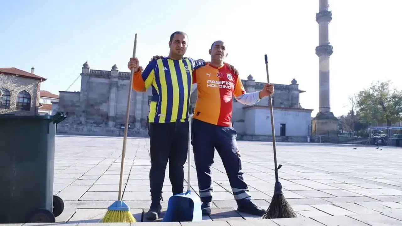 Türkiye’nin nefeslerini tuttuğu Galatasaray–Fenerbahçe derbisi yaklaşırken Aksaray’dan yüreklere dokunan bir görüntü geldi. Aksaray Belediyesi Temizlik İşleri Müdürlüğü’nde görev yapan Hazret Özkanlı (35) ile Ferdi Yılmaz (27), tuttukları takımların formalarını giyerek işe geldi.