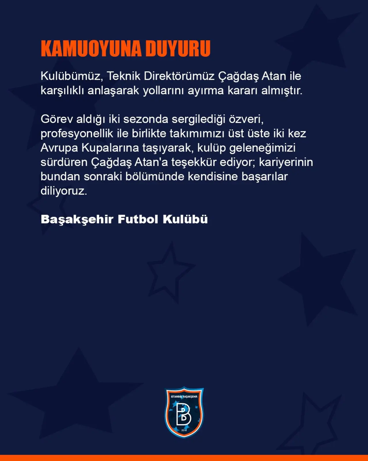 Başakşehir Kulübünden yapılan açıklamada, “Kulübümüz, teknik direktörümüz Çağdaş Atan ile karşılıklı anlaşarak yollarını ayırma kararı almıştır. Görev aldığı iki sezonda sergilediği özveri, profesyonellik ile birlikte takımımızı üst üste iki kez Avrupa kupalarına taşıyarak, kulüp geleneğimizi sürdüren Çağdaş Atan'a teşekkür ediyor; kariyerinin bundan sonraki bölümünde kendisine başarılar diliyoruz” denildi.