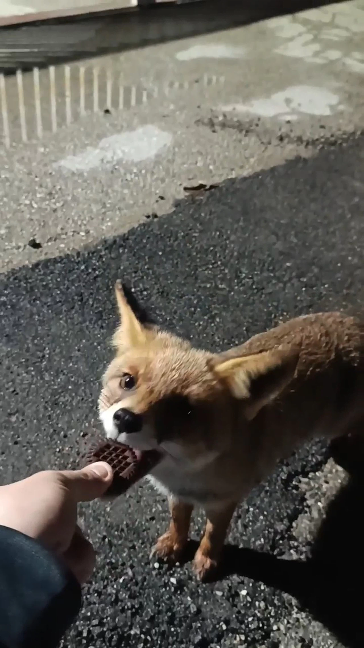 Burada, bir çalışan tilkiye elindeki bisküviyi vererek onu besledi.