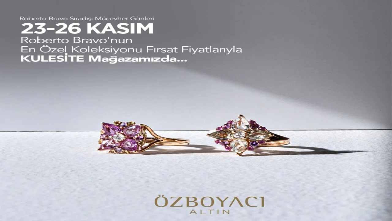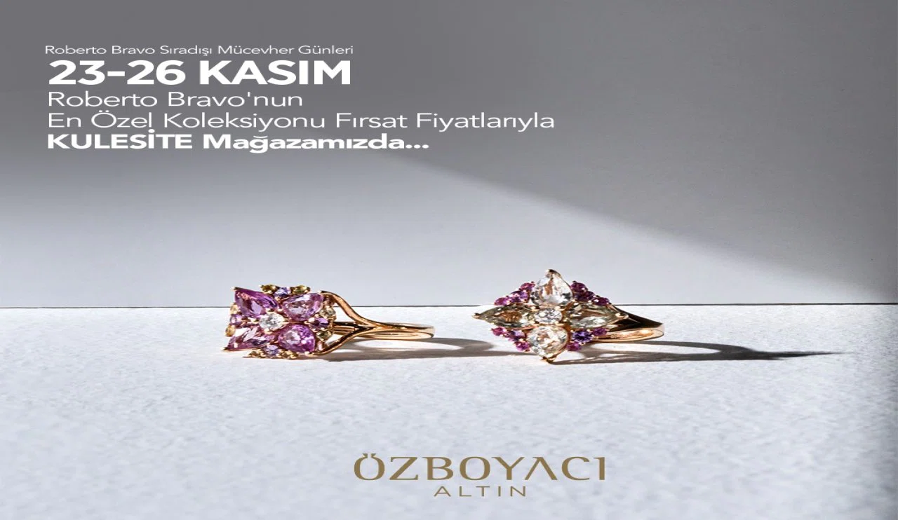 Özboyacı Altın Kulesite AVM içindeki mağazasında 23 Kasım’dan 26 Kasım tarihine kadar devam edecek olan Roberto Bravo ‘Sıradışı Mücevher Günleri’ farklı mücevher ürünleri sevenler için kaçırılmayacak bir etkinlik olma özelliği taşıyor. En özel koleksiyonlardan oluşan birbirinden farklı altın, elmas ve pırlanta tasarımlar farklı olmak isteyen kadınların beğenisine sunuluyor.