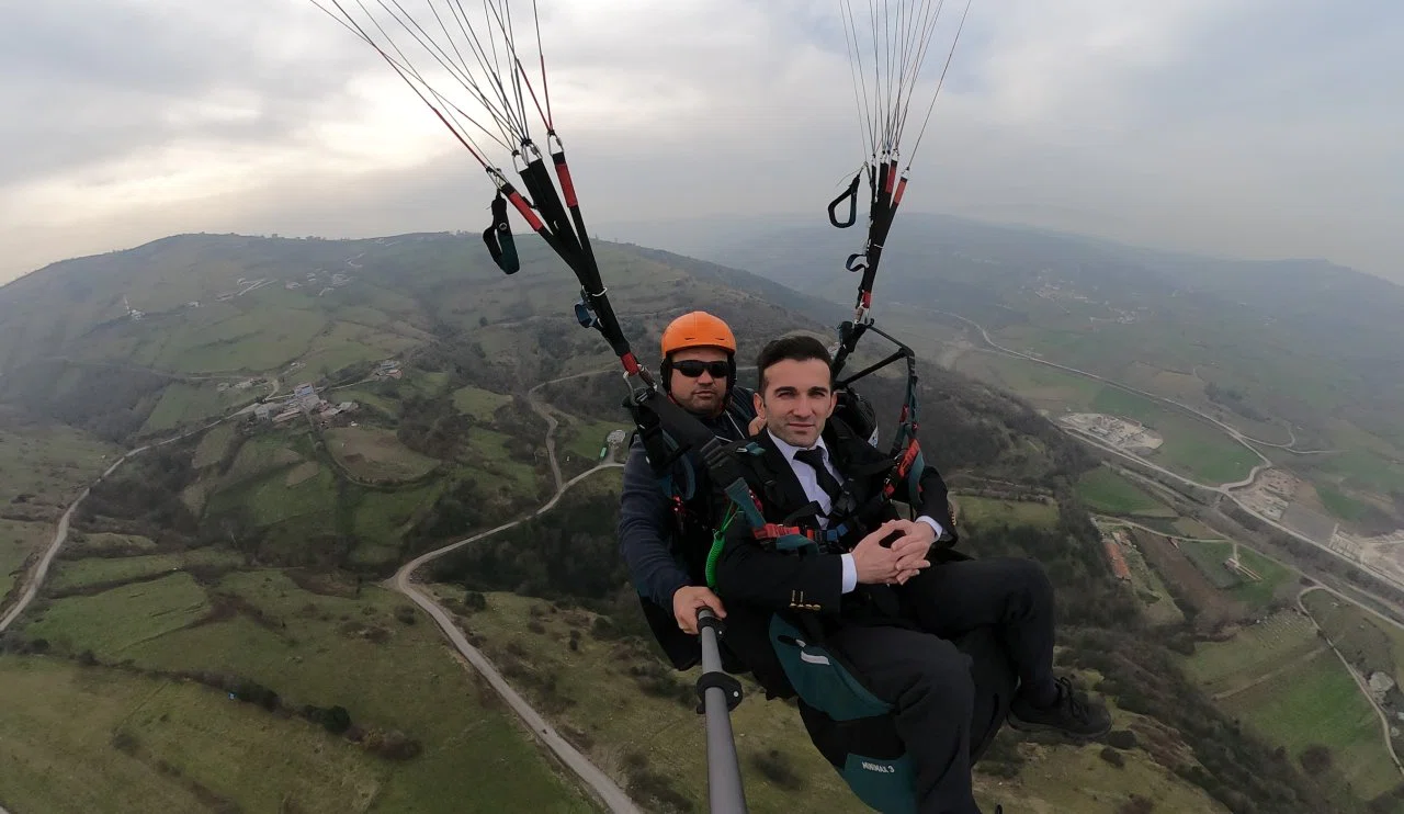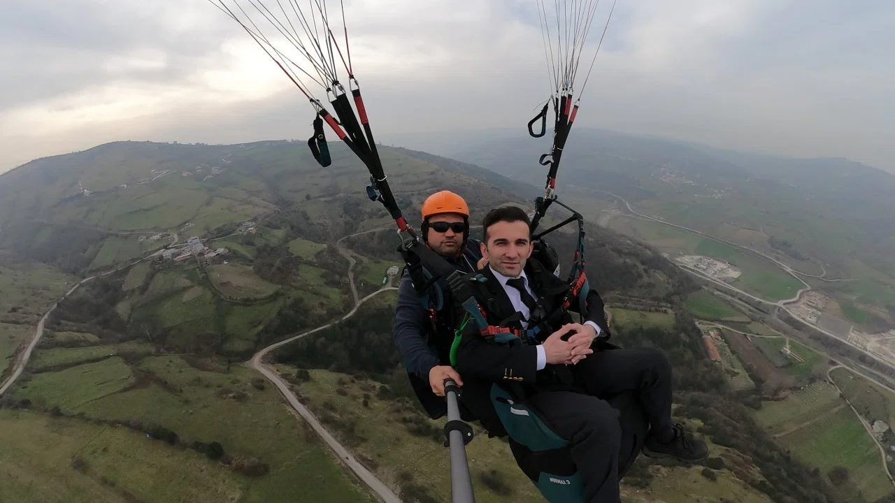 İHA'dan alınan habere göre: Samsun'da belediye başkan adayı olan Tugay Başsan, projelerini yamaç paraşütünde uçarken anlattı.