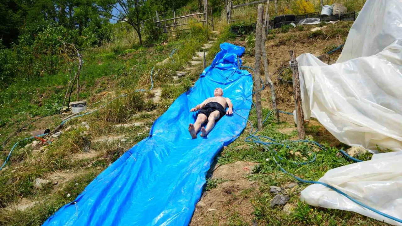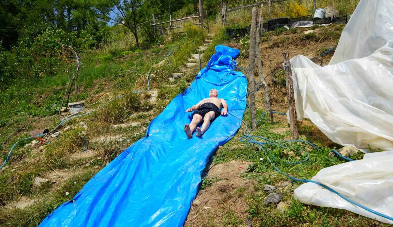 Kastamonu’nun Ağlı ilçesi Kabacı köyünde yaşayan Ergün Saraç, kendi imkânlarıyla bahçesinde bir aquapark kurdu. 2020’de pandemide İstanbul’dan köye taşınan 60 yaşındaki Saraç, torunu için branda kullanarak bir havuz ve su kaydırağı yaptı. Gündüzleri bahçede çalışan Saraç, sıcağın etkisini bu kaydırakta atıyor.
