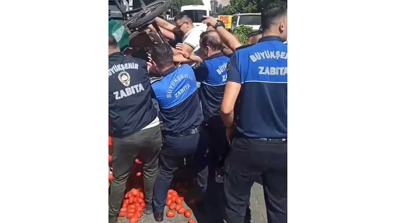 Zabıta ekipleri tezgahlara el koyarken meyve ve sebzeleri dökerek ziyan olmasına neden oldu. Ekipler seyyar satıcıların el arabalarına kamyonete koyarken ürünlerin bir kısmı da yollara döküldü.